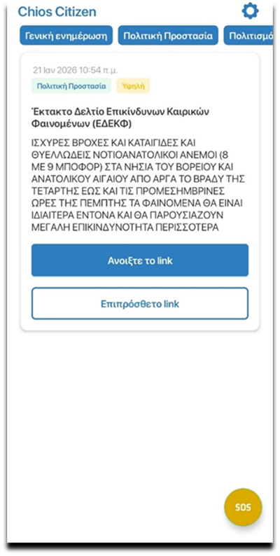 Ο Δήμος Χίου εισάγει μια πρωτοποριακή ψηφιακή υπηρεσία με στόχο την αναβάθμιση της πολιτικής προστασίας και την έγκαιρη ενημέρωση των κατοίκων και των επισκεπτών του νησιού για σημαντικά θέματα. Η Εφαρμογή Chios Citizen αποτελεί Σύστημα Άμεσης Προσέγγισης, το οποίο μέσω Push Notifications αποτελεί ένα σύγχρονο εργαλείο επικοινωνίας που επιτρέπει στη Δημοτική Αρχή να στέλνει βασικές πληροφορίες απευθείας στις κινητές συσκευές των πολιτών, τη στιγμή που χρειάζεται.